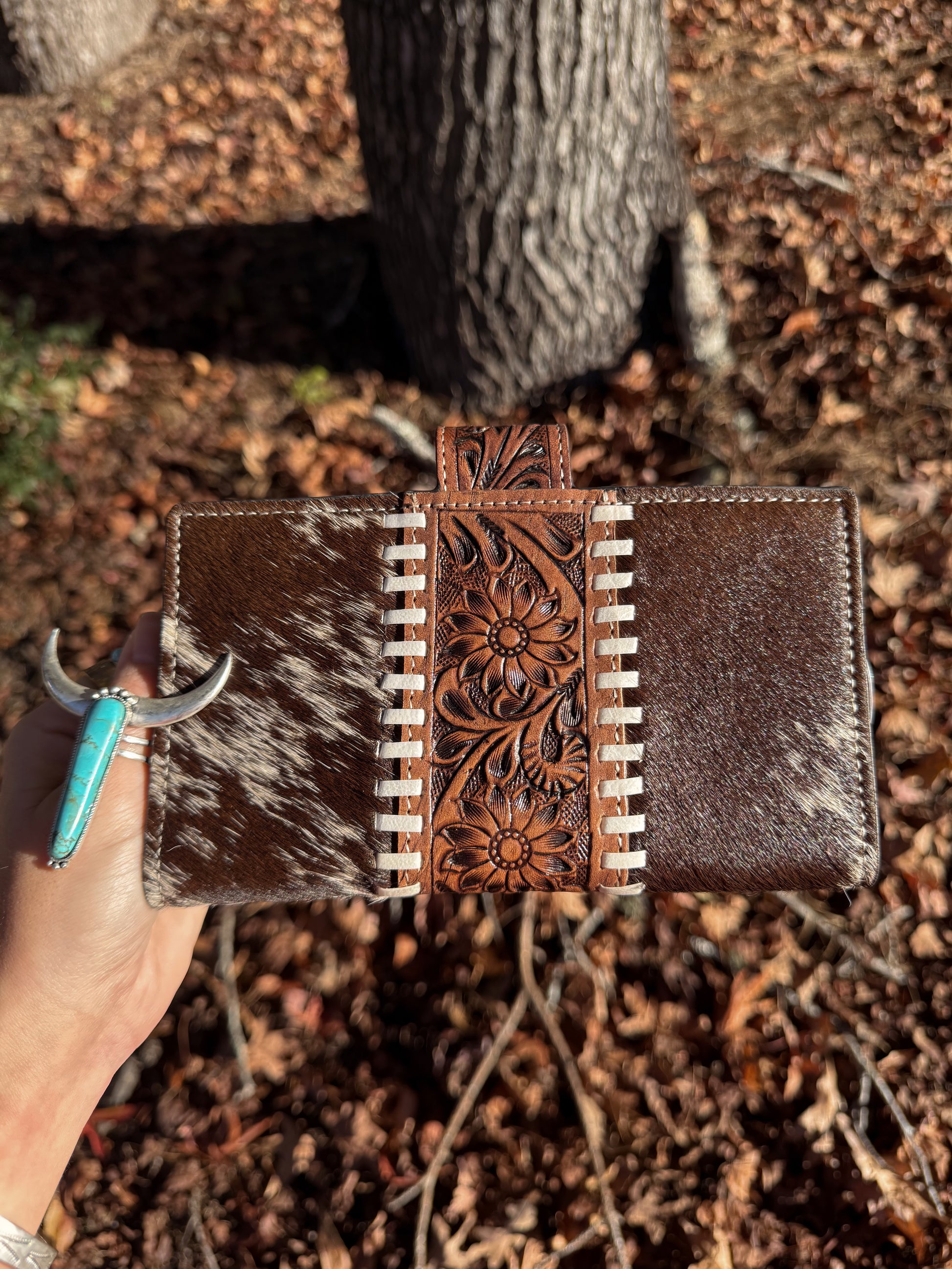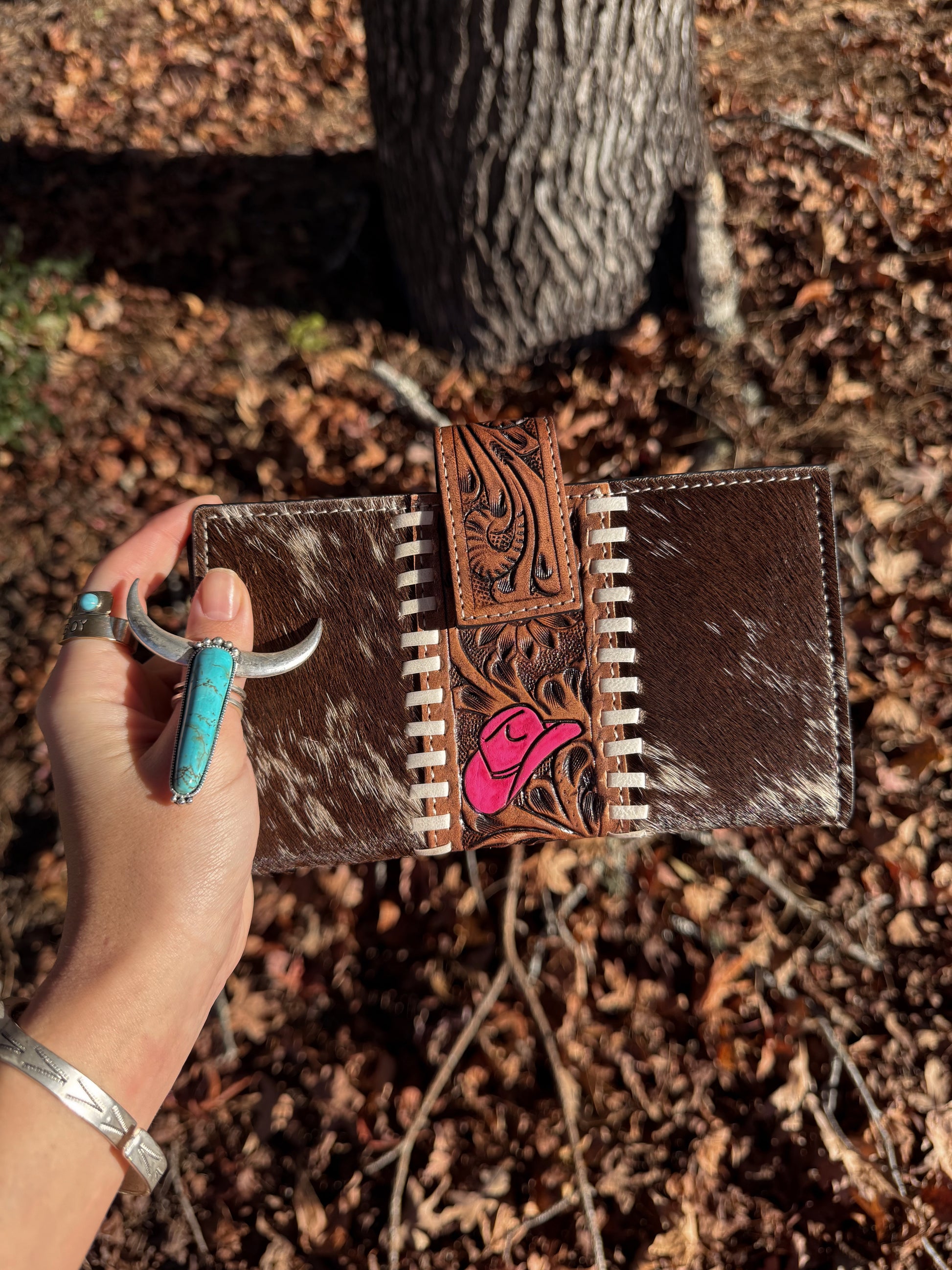 - Dark brown cowhide with white. Detailed leather tooled front with a cute pink cowboy hat.