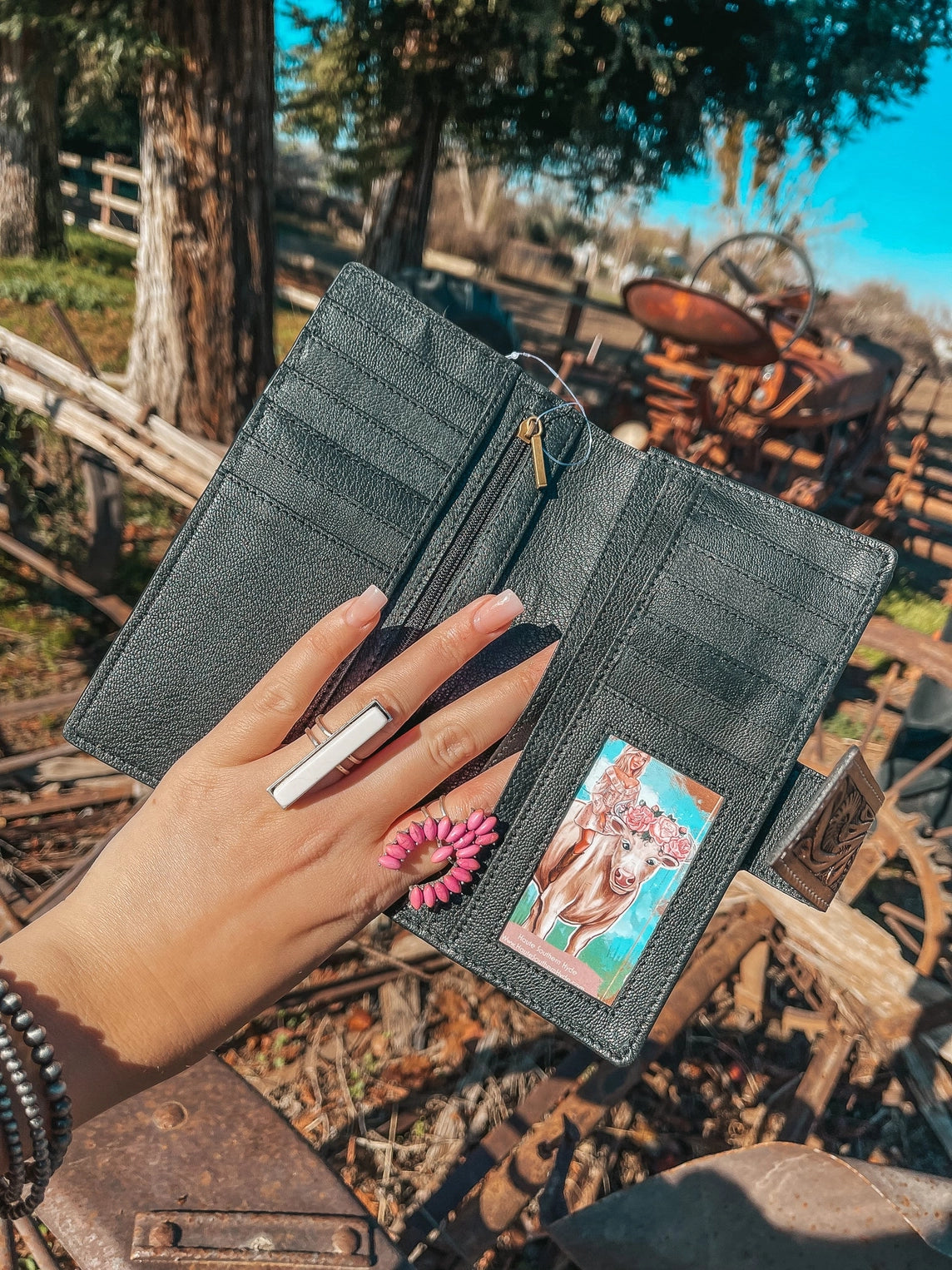 The Dolly wallet has 11 credit card slots, one ID window, 5 long body slots, and a zippered change pouch. It closes with a magnetic snap.